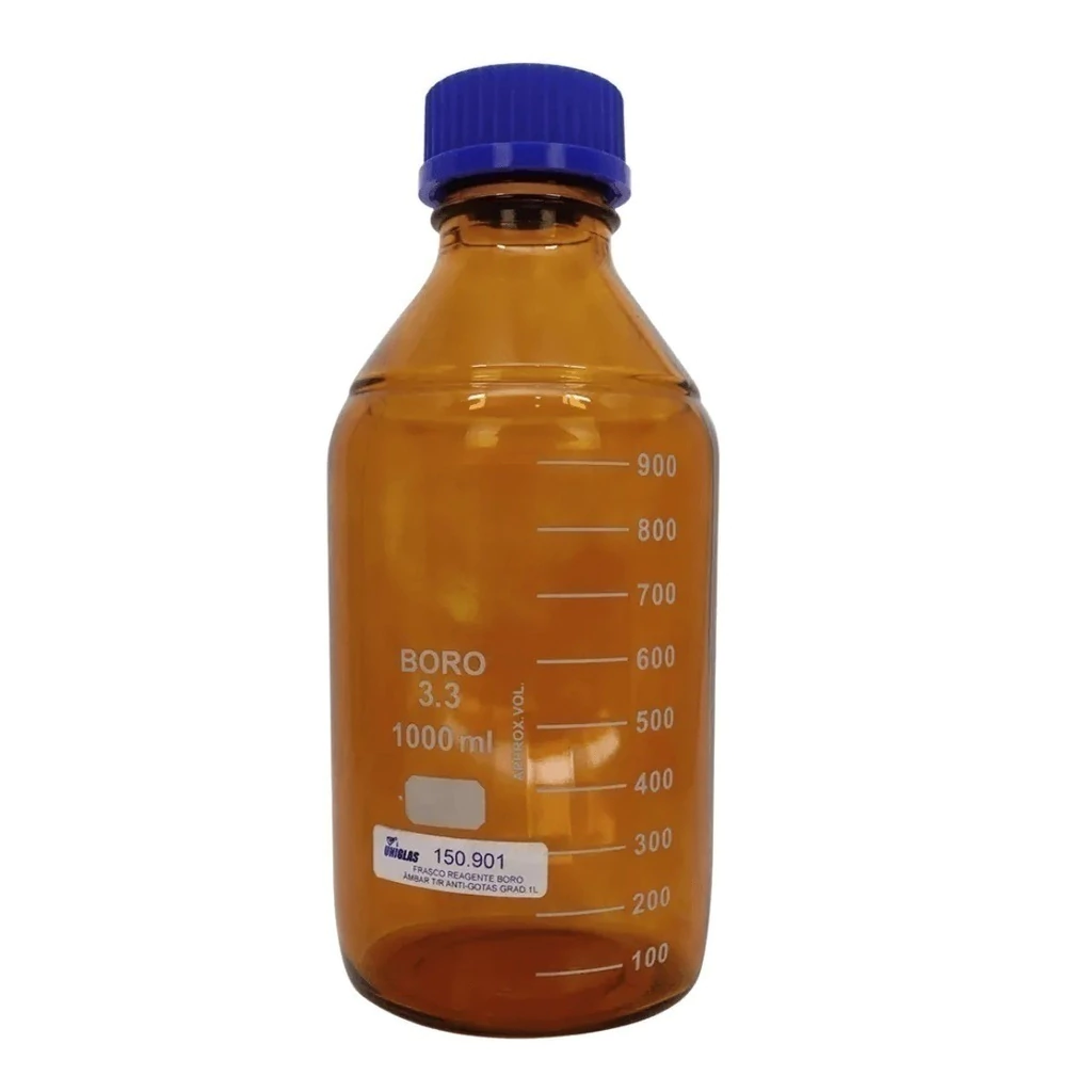 O Frasco Reagente Vidro Âmbar Boro 3.3 Graduado com Tampa de Rosca Anti-gotas Azul é ideal para armazenamento seguro de soluções, esterilização de meios de cultura, transporte e preparação de amostras em ambientes laboratoriais e industriais. Fabricado em vidro borossilicato 3.3, este frasco oferece alta resistência a produtos químicos e proteção contra a luz, sendo especialmente adequado para substâncias sensíveis à luz. A graduação em tinta branca permite medições precisas, e a tampa de rosca antigotas azul proporciona uma vedação segura e confiável, minimizando o risco de vazamentos.