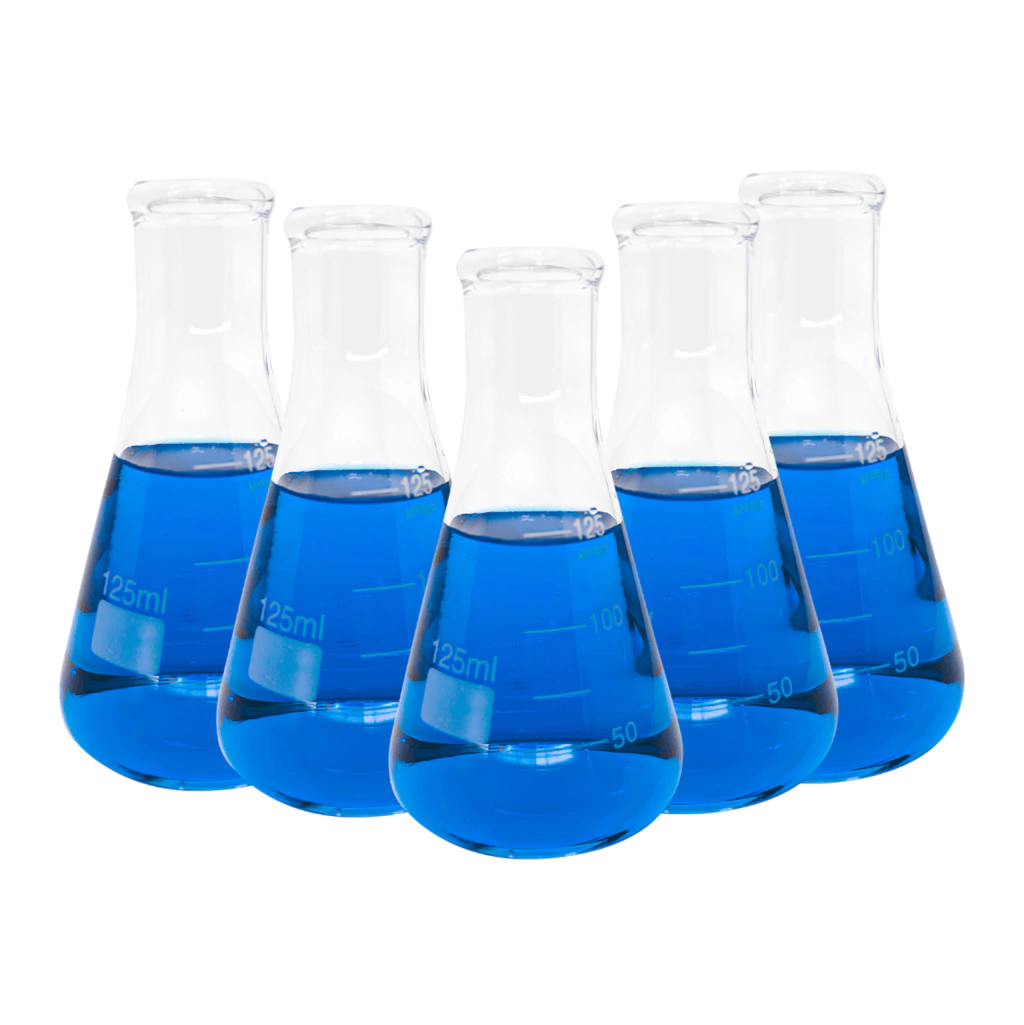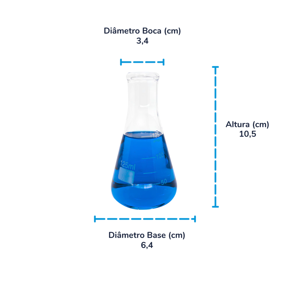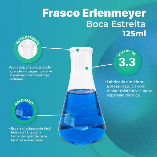 O Kit com 5 Frascos Erlenmeyer Graduados Boca Estreita 125mL é amplamente utilizado em laboratórios para titulações, mistura de soluções e medições aproximadas. Sua boca estreita permite agitação eficiente de líquidos, minimizando respingos e evaporação, tornando-o ideal para processos que exigem controle preciso de volume. Fabricados em vidro borossilicato 3.3, estes frascos oferecem alta resistência a variações térmicas e químicas, além de suportar aquecimentos para dissolução de meios microbiológicos e outros compostos. A graduação no corpo dos frascos facilita medições orientativas, sendo uma peça essencial para rotinas laboratoriais.