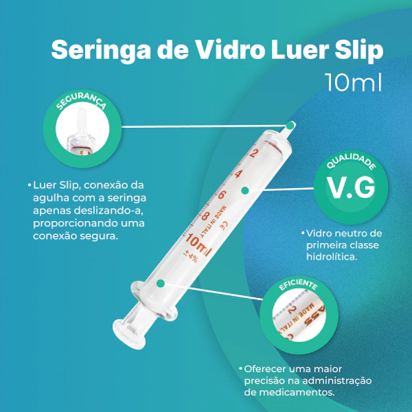 A Seringa de Vidro Luer Slip 10mL é uma vidraria utilizada em hospitais, laboratórios e ambientes que necessitam de precisão e segurança em testes e procedimentos clínicos. Fabricada em vidro neutro de primeira classe hidrolítica, a seringa é intercambiável e reutilizável, sem agulha. Recomenda-se a lavagem, enxágue, secagem e esterilização antes da primeira utilização e em todas as subsequentes. Não estéril, não deve ser esterilizada por radiação.