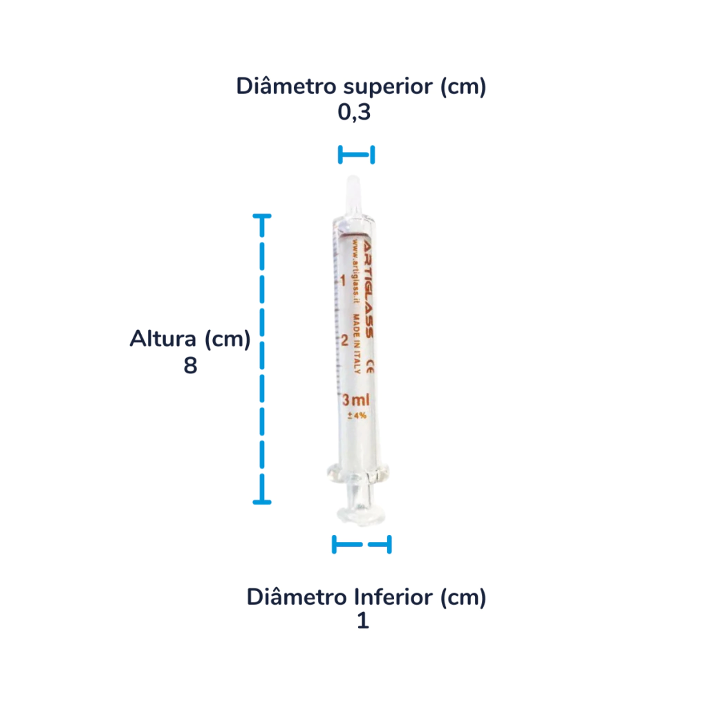 A Seringa de Vidro Luer Slip 3mL é uma vidraria utilizada em hospitais, laboratórios e ambientes que necessitam de precisão e segurança em testes e procedimentos clínicos. Fabricada em vidro neutro de primeira classe hidrolítica, a seringa é intercambiável e reutilizável, sem agulha. Recomenda-se a lavagem, enxágue, secagem e esterilização antes da primeira utilização e em todas as subsequentes. Não estéril, não deve ser esterilizada por radiação.