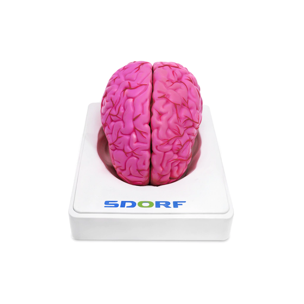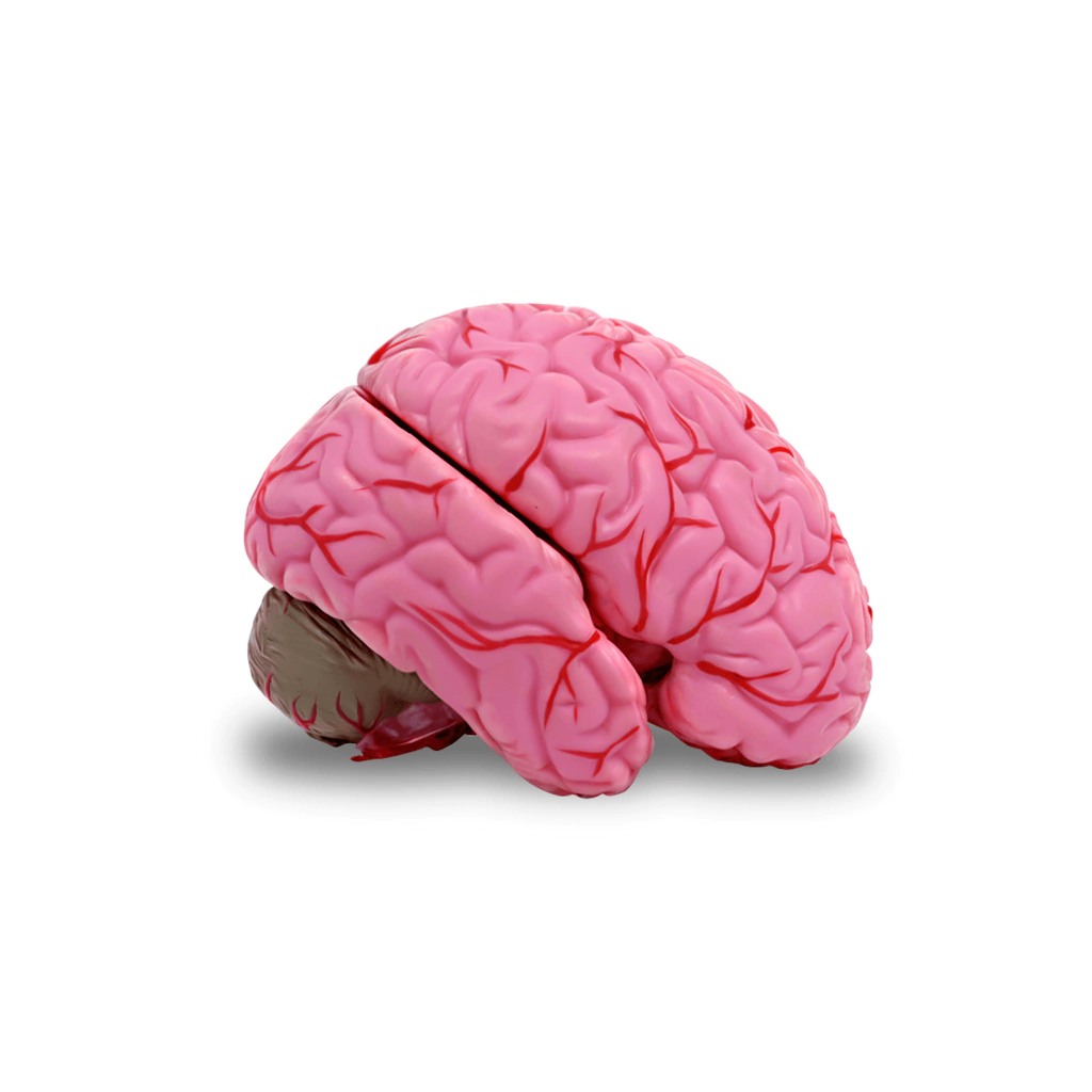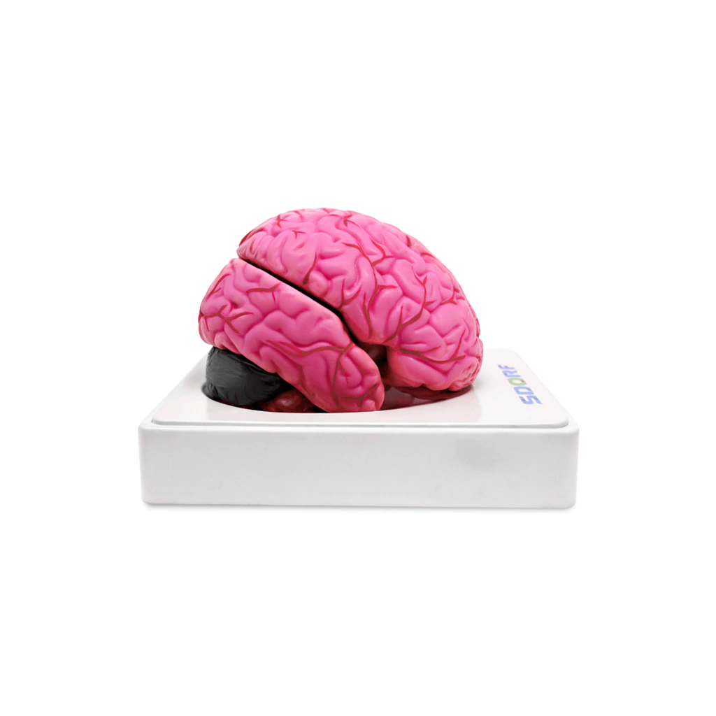 Modelo anatômico confeccionado em resina plástica e representa o cérebro humano em tamanho natural, dividido em 8 partes. O modelo é montado em uma base plástica.
