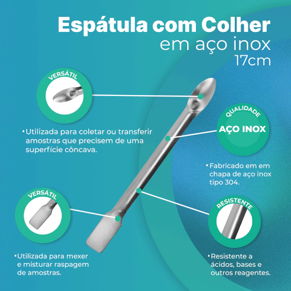 A Espátula com Colher em Aço Inox de 17cm é uma ferramenta essencial para laboratórios e outras instalações que lidam com substâncias pastosas e sólidas. Esta espátula dupla face, com uma extremidade plana e a outra em forma de colher, é perfeita para misturar, transferir e pesar substâncias com precisão e facilidade. Fabricada em aço inoxidável de alta qualidade, oferece resistência a ácidos, bases e outros agentes químicos, garantindo durabilidade e confiabilidade em todas as aplicações.