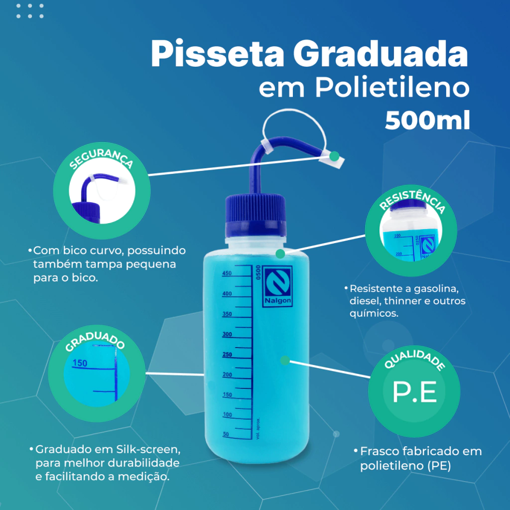 A Pisseta Bico Curvo Azul Graduada é um instrumento essencial para qualquer laboratório, seja ele de pesquisa, educacional ou industrial. Este recipiente é especialmente projetado para a lavagem de materiais ou recipientes através de jatos de água, álcool ou outros solventes. Sua construção em polietileno a torna resistente e durável, garantindo um desempenho confiável mesmo em condições de uso intensivo.