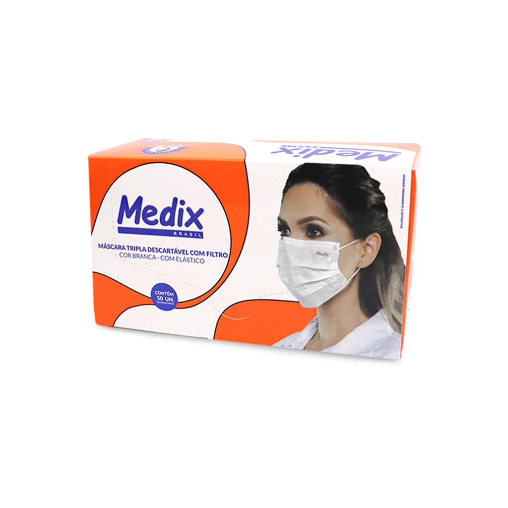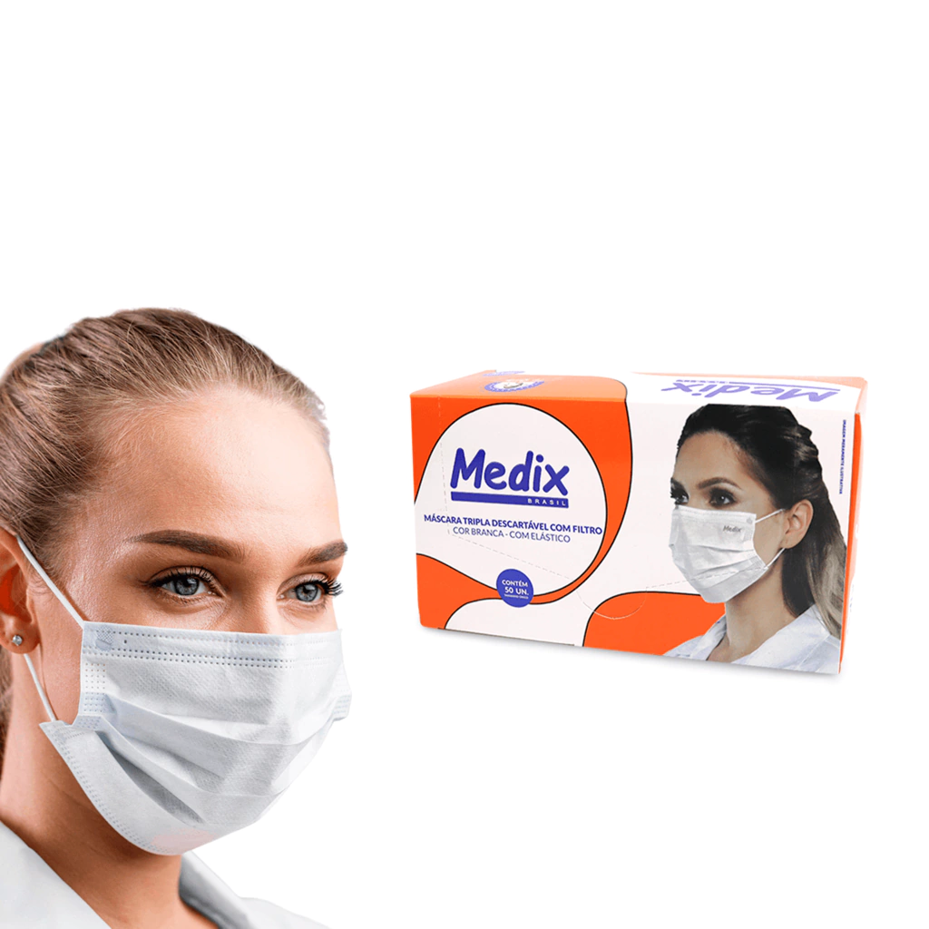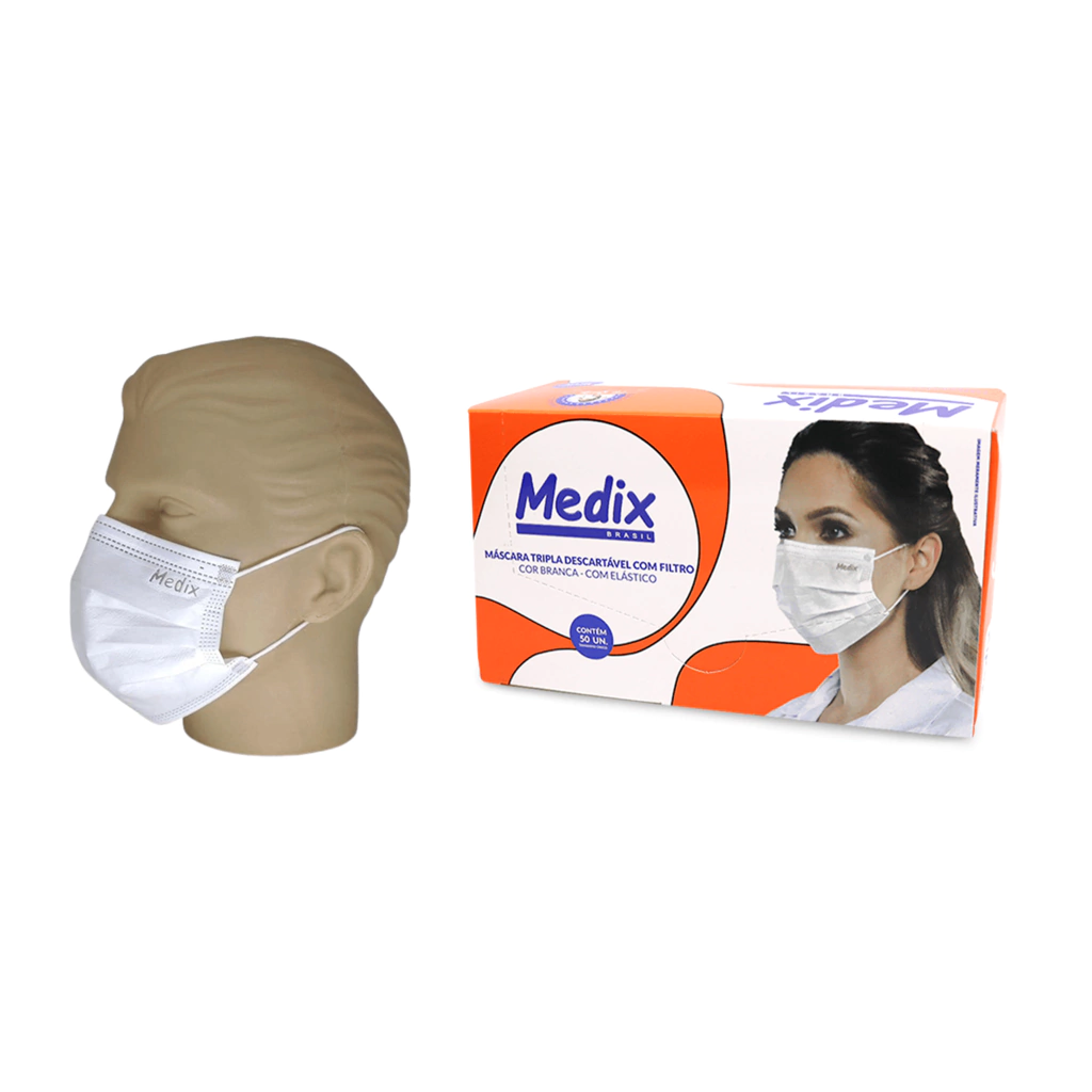 - Máscara Cirúrgica Descartável Tripla Camada com Elástico e Clipe Nasal (50 Unidades);