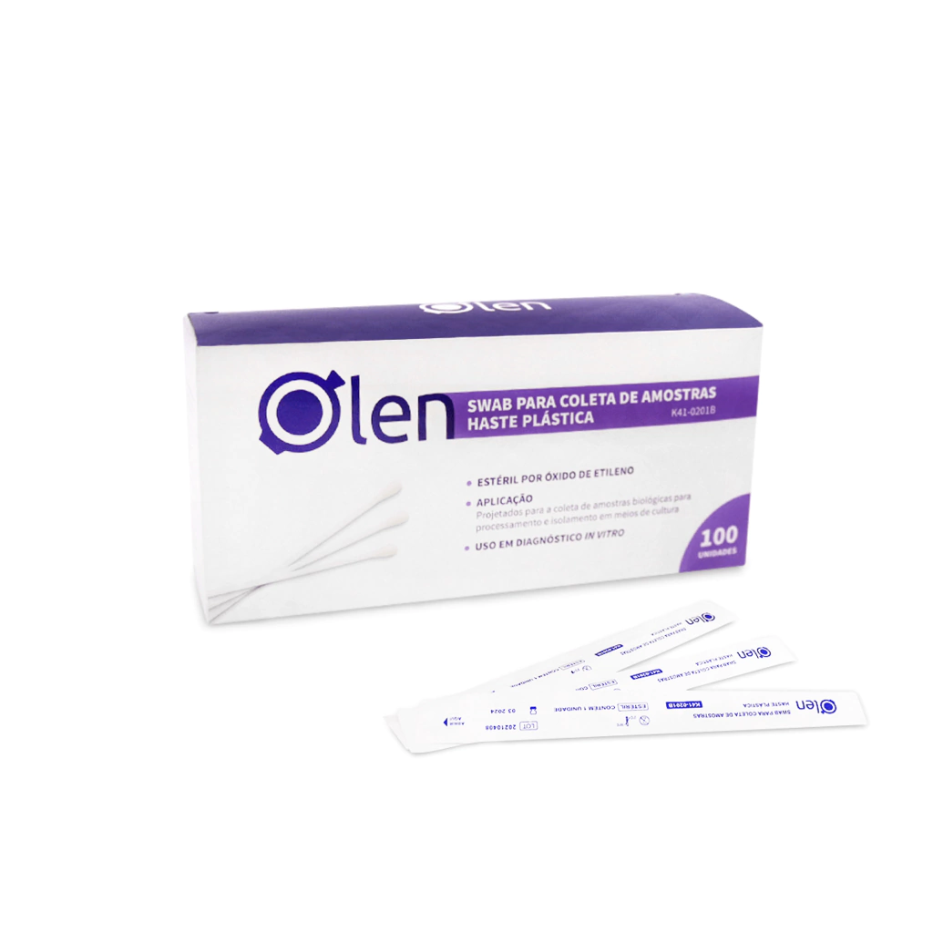 • Uma caixa contendo 100 unidades de Swabs Esterilizados para Coleta de Amostras com hastes plásticas.