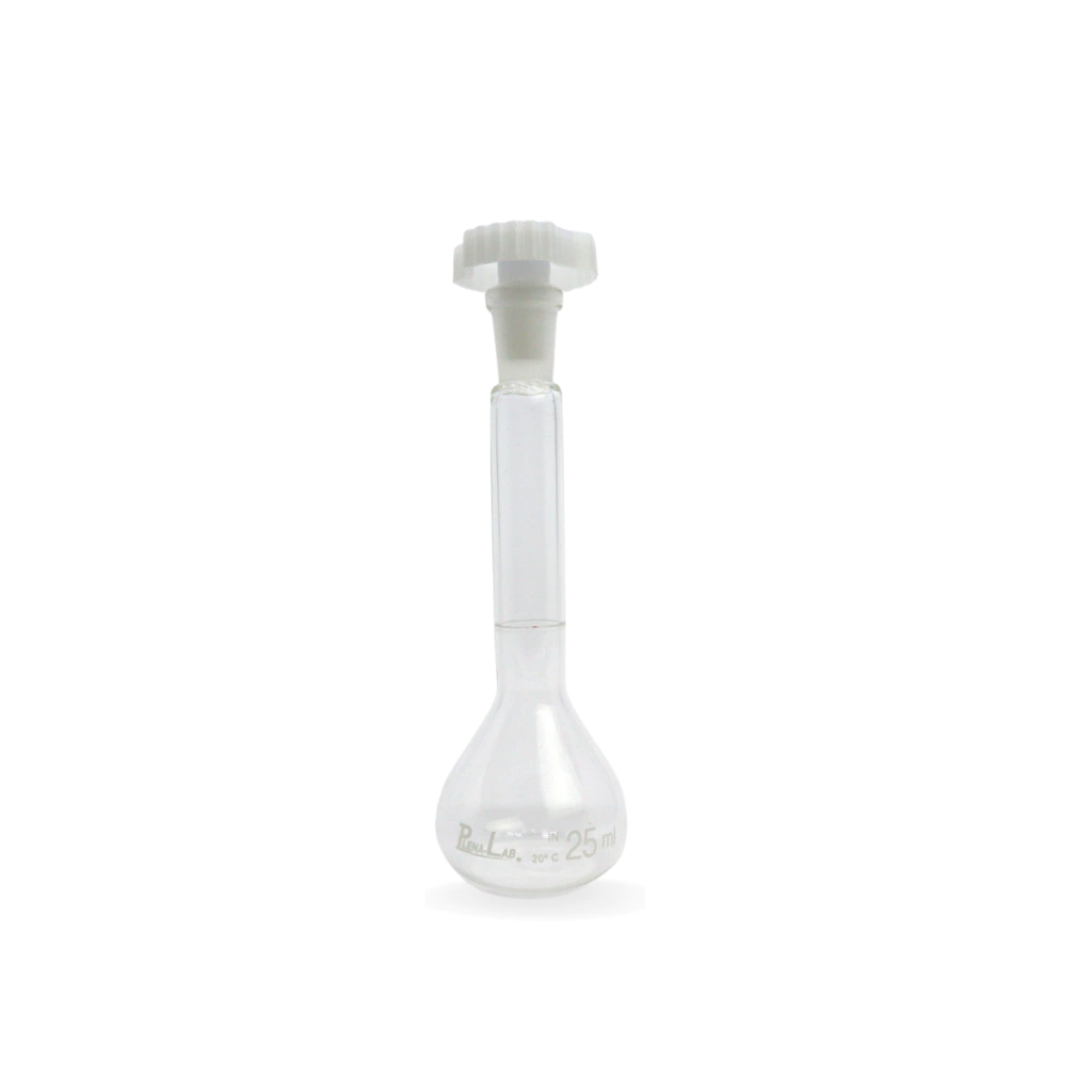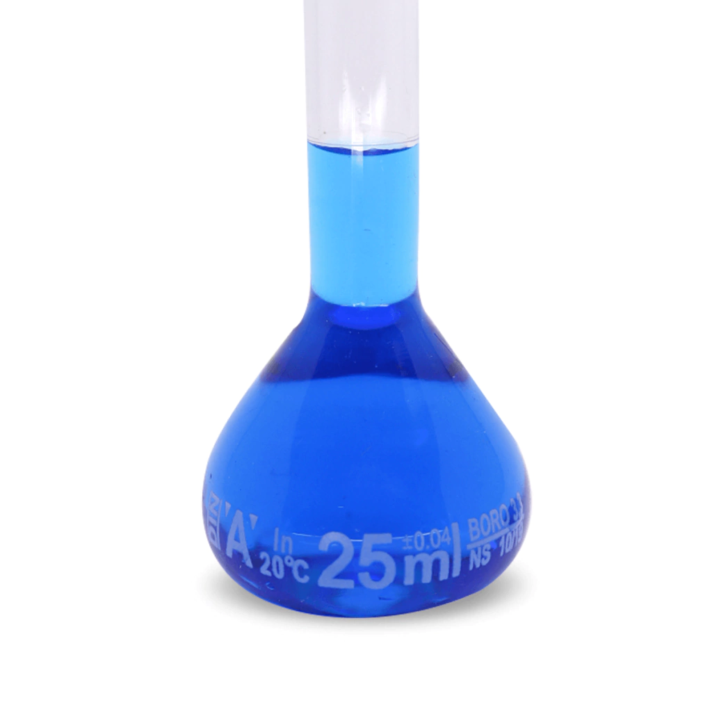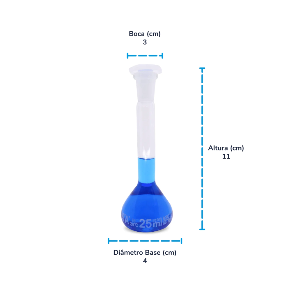 Balão Volumétrico com Rolha de Poli é uma ferramenta essencial para laboratórios e indústrias que necessitam de medições precisas e preparo de soluções com concentração conhecida e volume exato. Este balão de vidro transparente, com formato de "pêra", fundo chato e pescoço alongado, é ideal para armazenar e preparar soluções, garantindo precisão e eficiência.