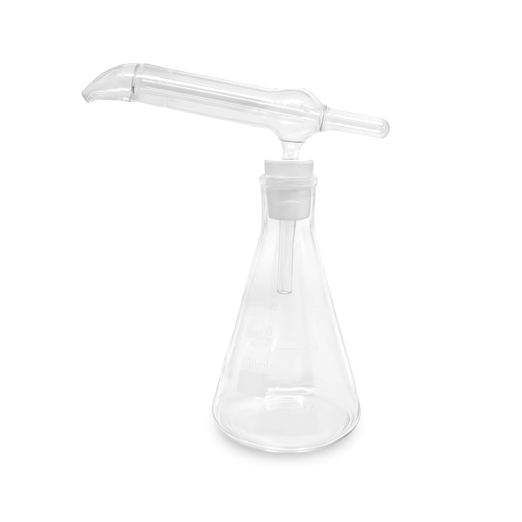 - Conjunto composto por pipeta Kipp (Bico de Papagaio), frasco Erlenmeyer de 500 mL e rolha de borracha com furo;
